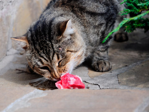 El siguiente paso es la transición de su gato a la dieta cruda. Qué tan fácil será, depende de su gato. Algunos gatos se comen una dieta de carne cruda, tan pronto como se presenta, sobre todo los jóvenes o los que estaban acostumbrados a comer alimento crudo enlatado . Otros gatos tendrán más dificultades en la transición. No se desanime si su gato no quiere comer en un primer momento. Este es un gran paso para ellos y hay que ser paciente. La mayoría de la gente comienza con una dieta de carne molida. La consistencias similar a los alimentos enlatados, así que en ese sentido, es más familiar para un gato que es reacio. También es más familiar para los seres humanos. Entendemos que la alimentación con trozos de carne o cortes de carne con huesos puede tomar un poco de tiempo. Usted puede, y debe, introducirlos en algún momento. Pero, no es necesario en la etapa de transición. Hay muchas formas de hacer la transición a su gato. Es posible que tenga que probar más de una. Recuerde que este es un gran cambio para su gato. Las carnes crudas tienen sólo un olor sutil, por lo que un gato acostumbrado a los alimentos secos o enlatados altamente aromáticos podrían no reconocerlas como alimentos al principio. Mucha gente va hacer uso de ciertos alimentos como sobornos para conseguir que sus gatos prueben este nuevo alimento. Recuerde por encima de todo, ser paciente y persistente!